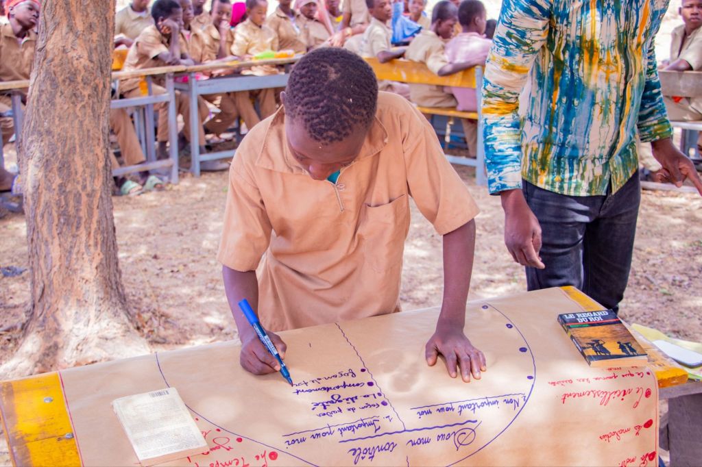 Après les travaux au bureau, la mission s’est poursuivie au lycée départemental de Gogo, où les élèves ont effectué une séance de lecture et de monitoring autour du roman Les frasques d’Ebinto. Sous la modération d’un enseignant, les jeunes ont débattu du comportement du personnage principal, développant ainsi leur esprit critique et leur capacité d’analyse. Dans le même établissement, la coordination a échangé avec un groupe d’élèves bénéficiaires du projet lors d’une activité de dessin. Les illustrations produites reflétaient leur ressenti et leur perception du programme, offrant un regard sensible sur l’impact des actions menées.
